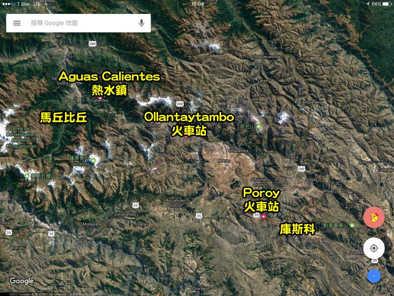 從上圖可以看出庫斯科、Poroy火車站(以下簡稱P站)、Ollantaytambo火車站(以下簡稱O站)、Aguas Calientes(以下稱熱水鎮)、馬丘比丘的相對位置。