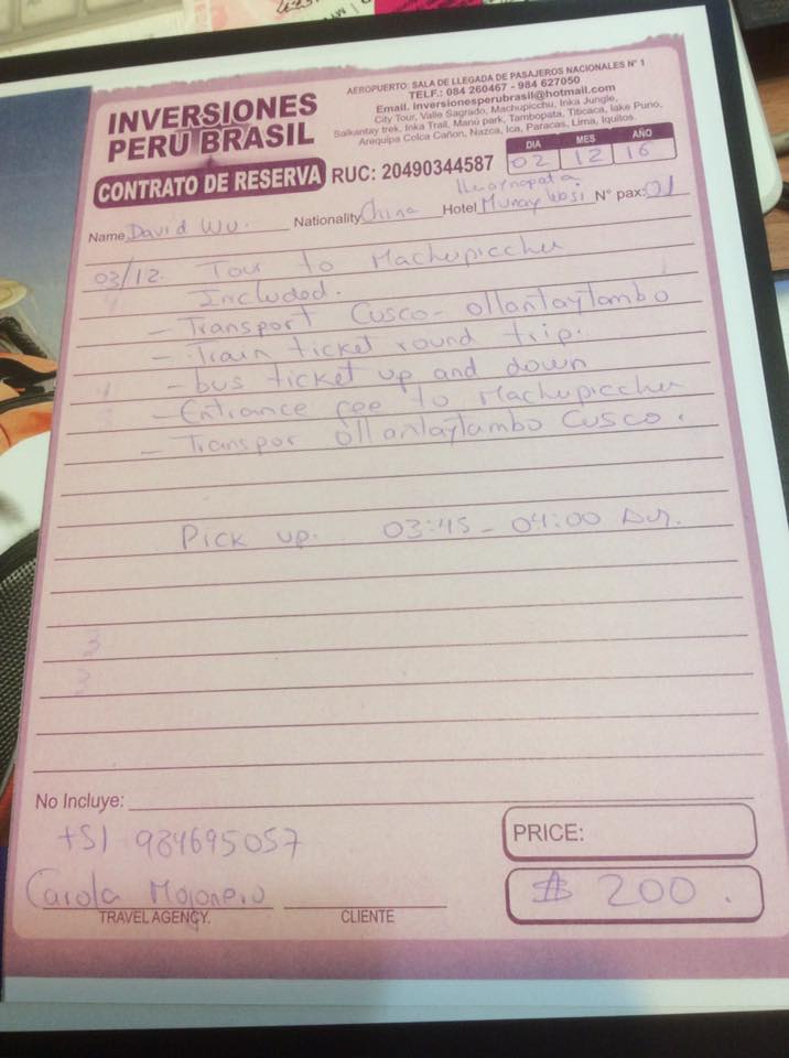 這家旅行社在庫斯科機場有設櫃臺,馬丘比丘火車票、門票全包價原本開價250美元,後來被我砍倒200美元,他說200的話沒有tour guide,無妨,自己逛就可以了!