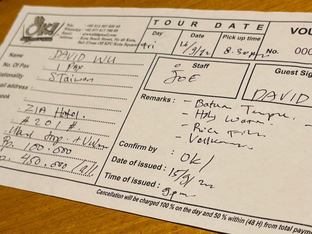 昨天下午下大雨,就乖乖窩在庫塔海灘沒什麼出門,昨晚看 weather.com 逐時天氣預報今天好天氣,馬上到大街上隨便找一個 tour information desk,我只要求三個景點:金塔瑪尼火山群、聖泉寺、梯田,其它同路線附加景點由司機安排,最後以550K(台幣約$1170)成交👌