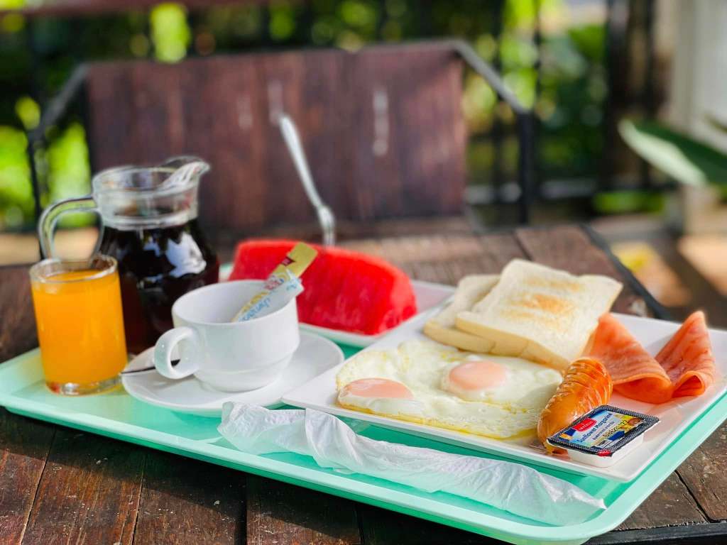 這家旅館房費是含早餐的,前一個晚上跟櫃檯說幾點要吃,隔天早上時間到準時送來小屋的露台用餐,學法國人慢慢吃一個小時,也不是不可以吧?