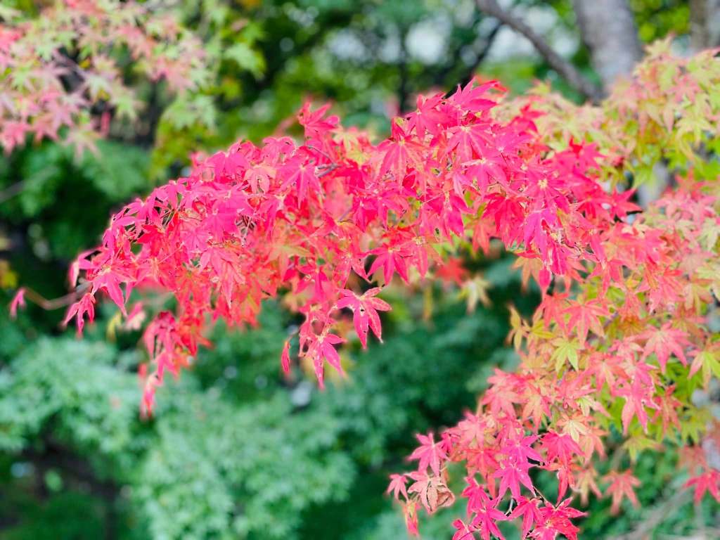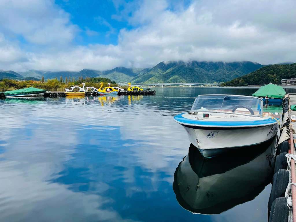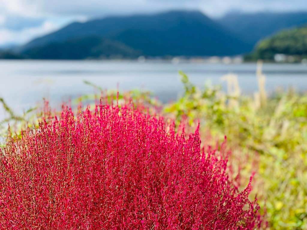 十月中旬已經進入深秋的季節,河口湖百花爭豔,楓葉也不經意地染成深紅的樣子🍁今天天色奇佳,因為早上剛下過雨,我沒有買任何交通套票,決定以步行方式沿著湖的東側,好好欣賞這波光粼粼的湖景。