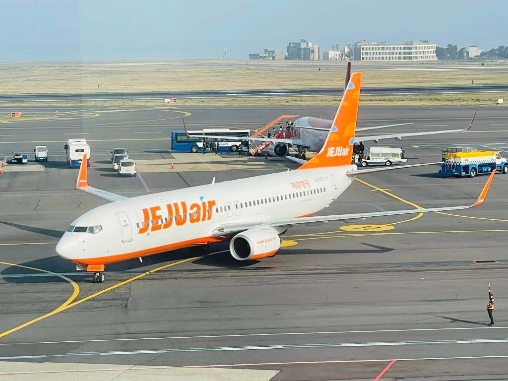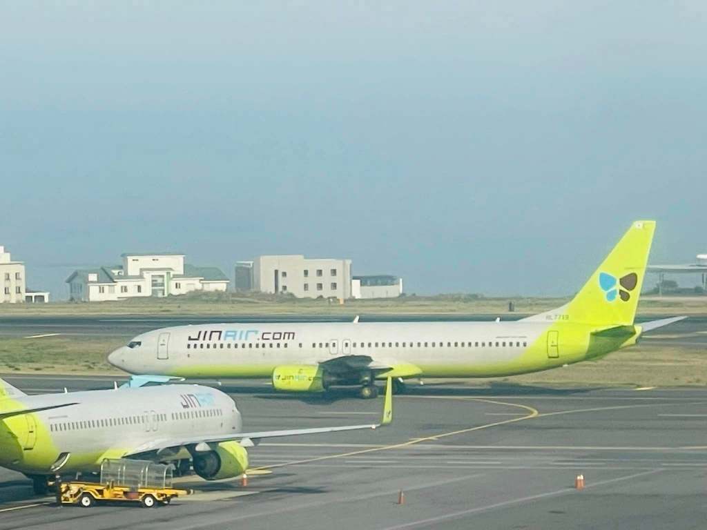 濟州島機場的觀景台視野很好,飛機就大剌剌、近距離從眼前經過,短短幾分鐘就將韓系航空一網打盡:德威、濟州、大韓、韓亞航、真航空、釜山航空。