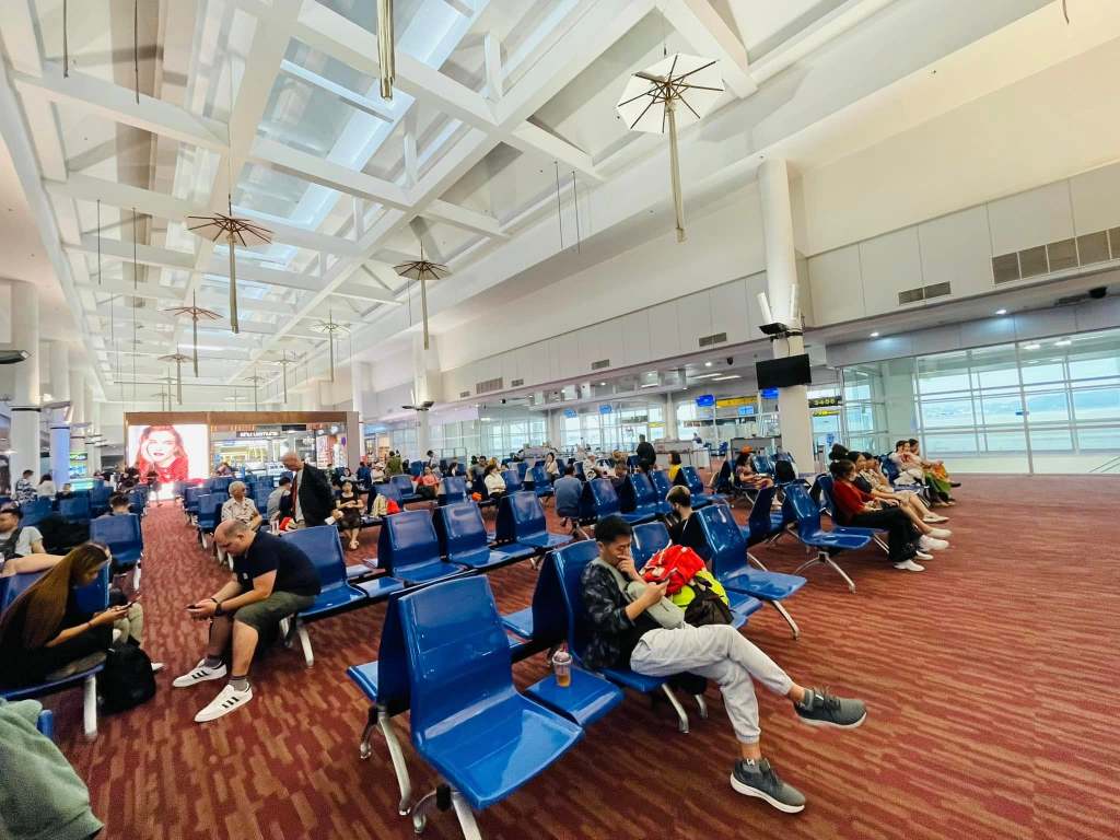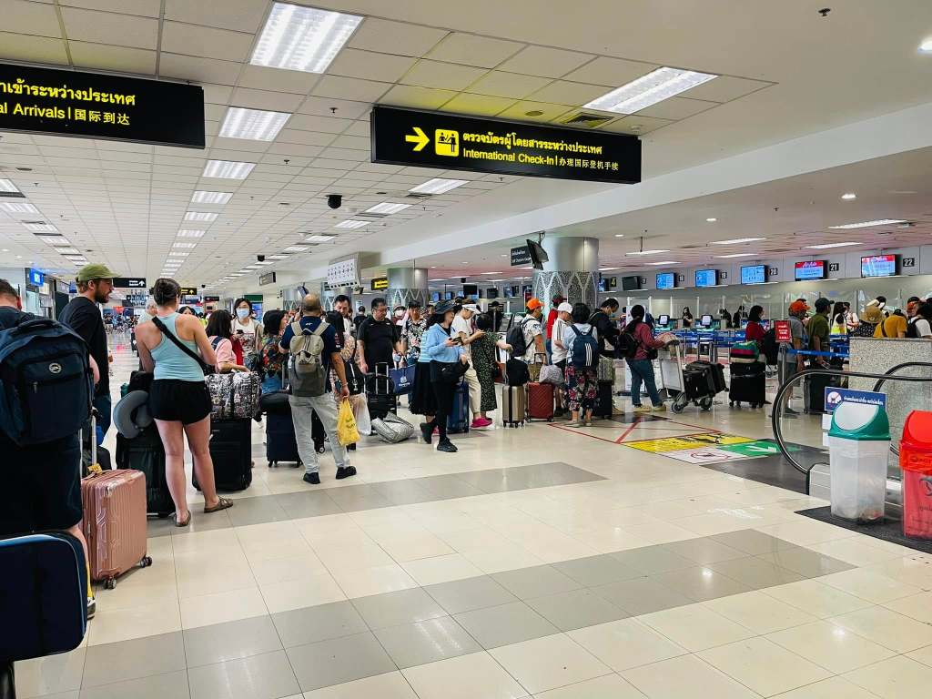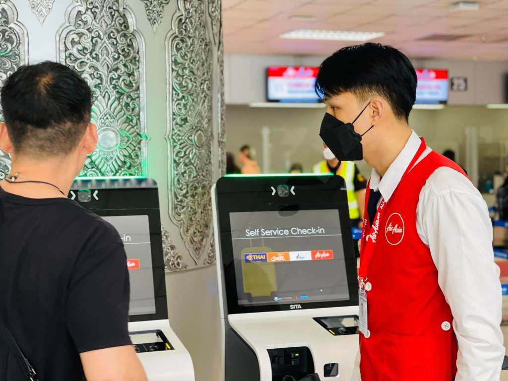 亞航在清邁機場的國際線無法使用自助報到,一律排人工check in櫃檯,因此形成一條長長的人龍,還好一次開六個櫃檯,大約排了三十分鐘拿到登機證。