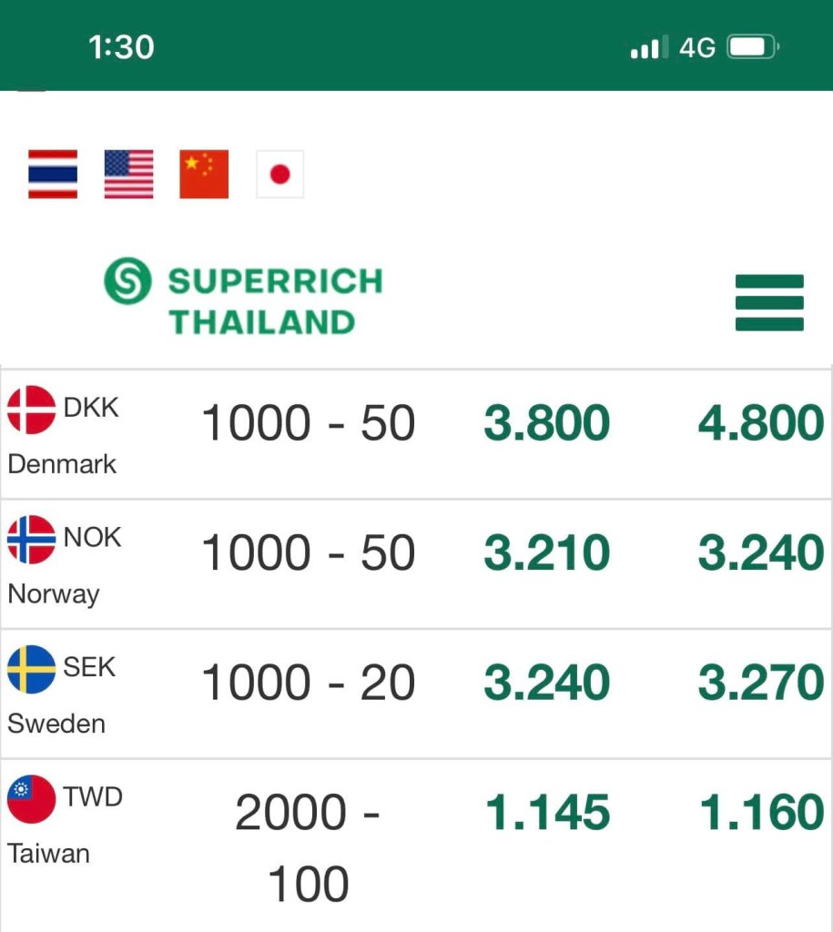 綠標 Superrich Thailand 臺幣兌換泰銖匯率最優,10000臺幣換11450泰銖,小編因為之後去格陵蘭需要用到丹麥克朗,強大的SUPERRICH馬上調度出DKK現鈔,曼谷應該是全世界換匯最容易的地方。