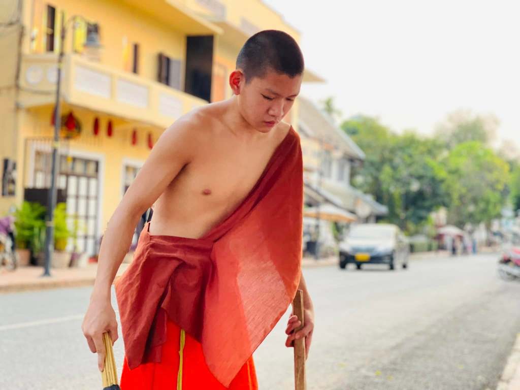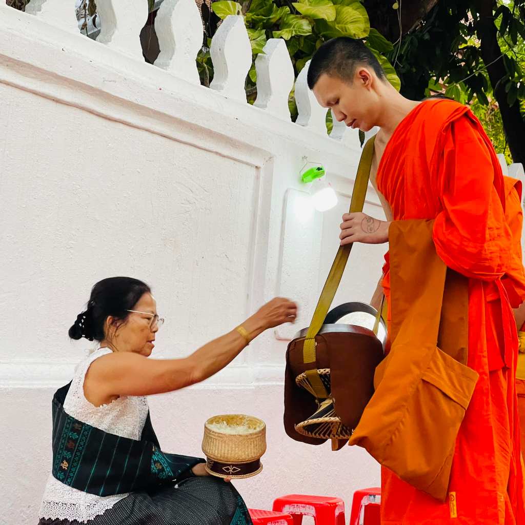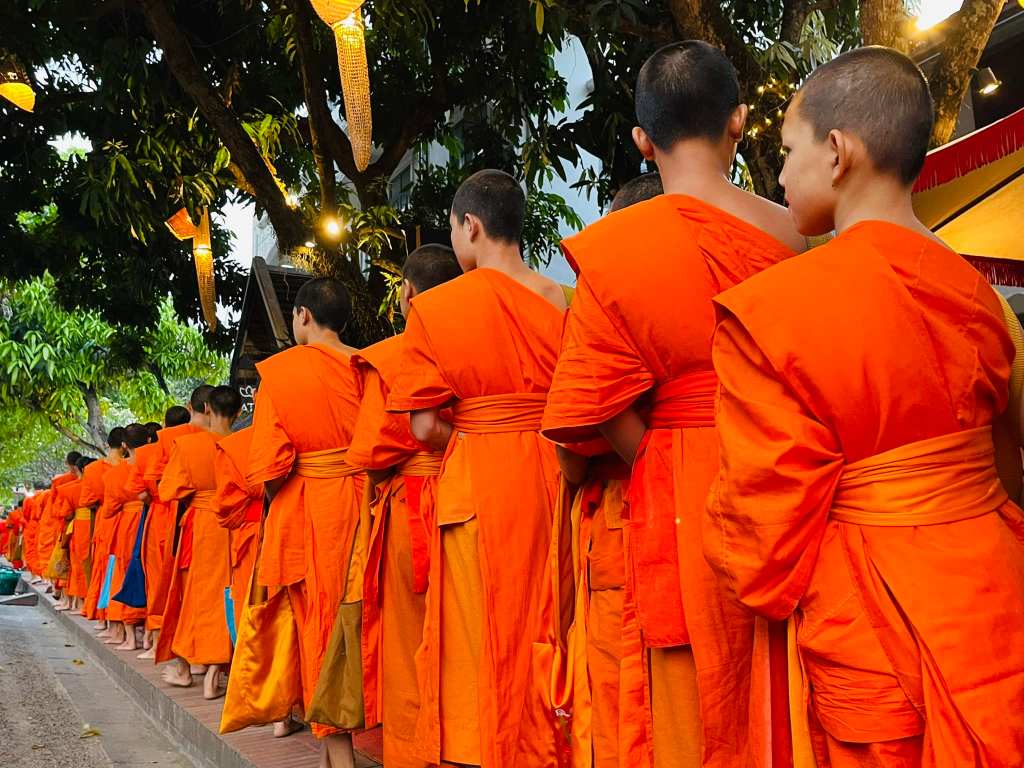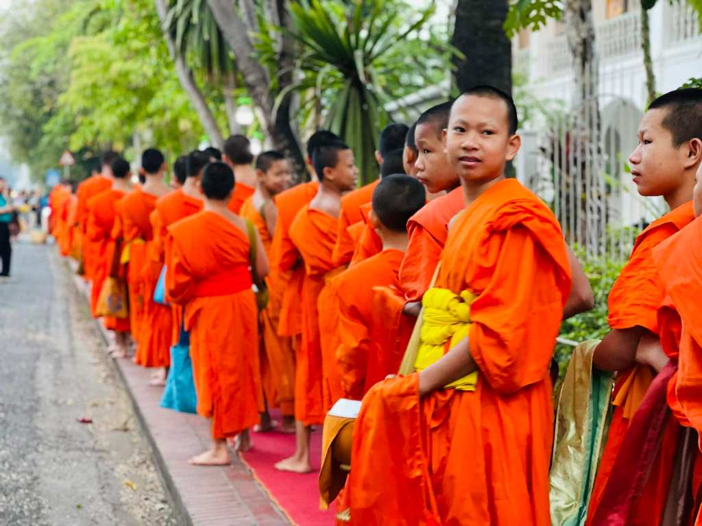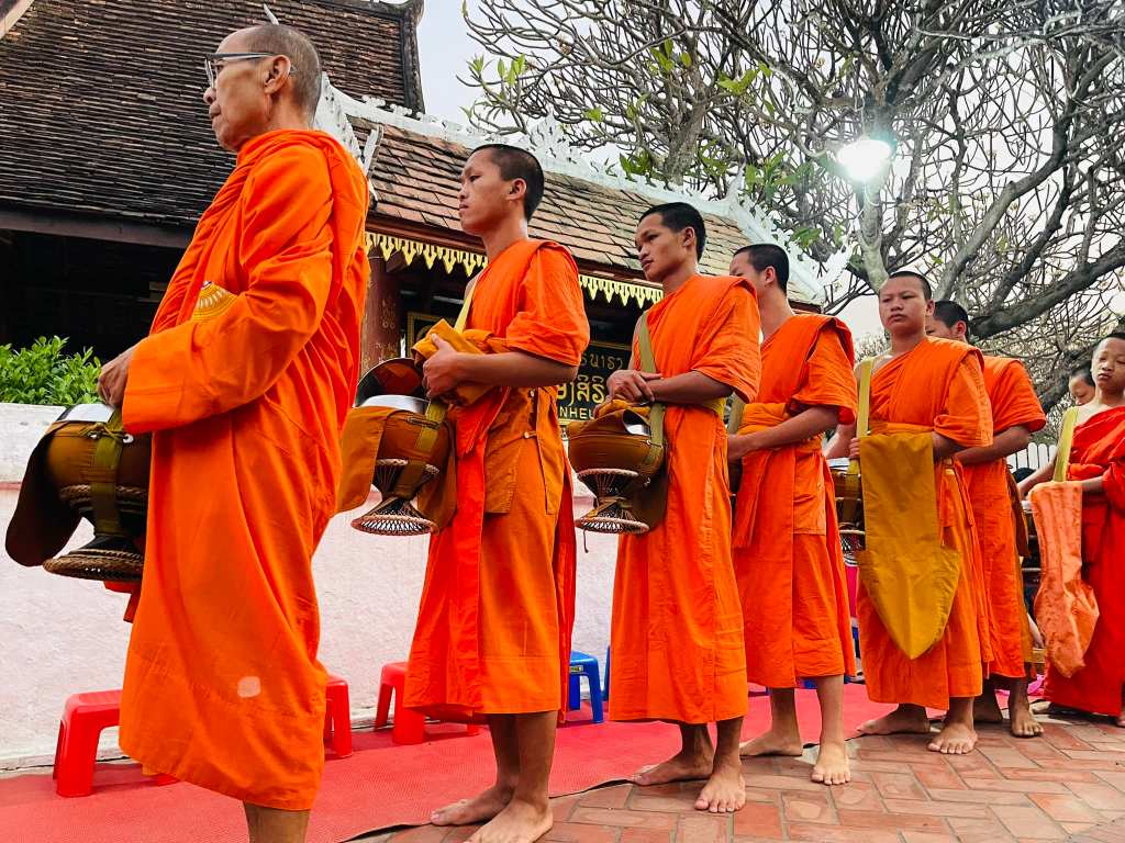 龍波邦每天凌晨六點的例行公事,就是上百僧侶身著橘紅色僧袍,徐徐行走於街道上接受民眾的佈施,佈施的內容物有現金、糯米、餅乾、糖果。