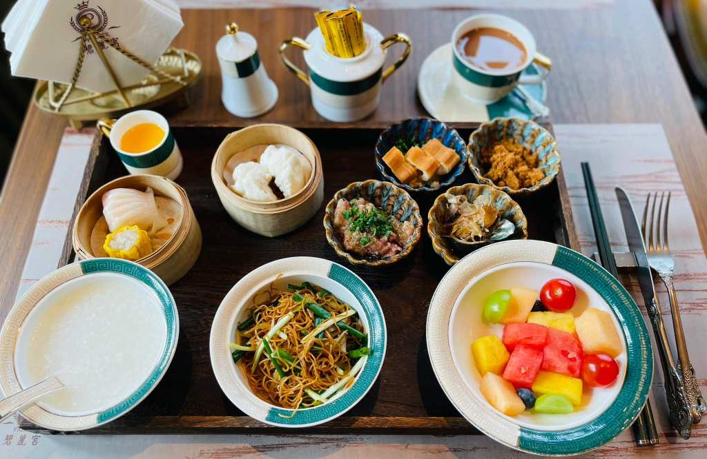 新中央酒店 Hotel Central Macau 除了復古的住房,連早餐也濃濃的中式風:廣東白粥、豉油王炒麵、佐粥小菜三款、經典點心三款、水果盤、港式奶茶、柳橙汁。