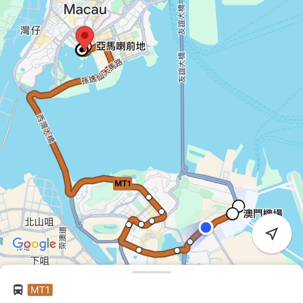 走出機場往左邊方向直走,就可以看到MT1公車站牌,上車投幣$6(港幣或澳門幣皆可)不用半小時就可以抵達「亞馬喇前地」很方便❗️